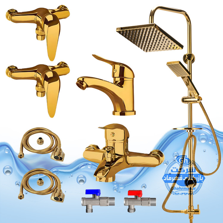ست ۹ عددی شیرآلات برند آیدا صنعت مدل قهرمان اردکی | شیر روشویی + حمام + دو عدد توالت + علم دوش یونیورست رسوب‌گیر اتومات + دو شلنگ توالت + دو عدد پیسوار برنجی | طلایی براق